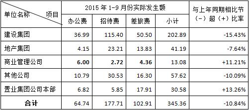 2015年1至9月份全集團三項費用(yòng)共計發生345.36萬元,與上年同期相比下降10.84%。實際發生數據見下表: